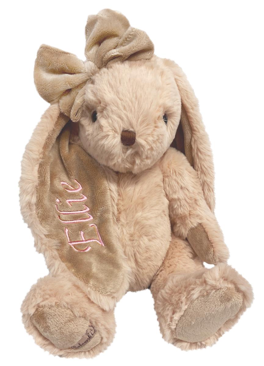 Kaniners öron samt snuttfiltar broderas rakt igenom, d.v.s. texten syns även på baksidan.